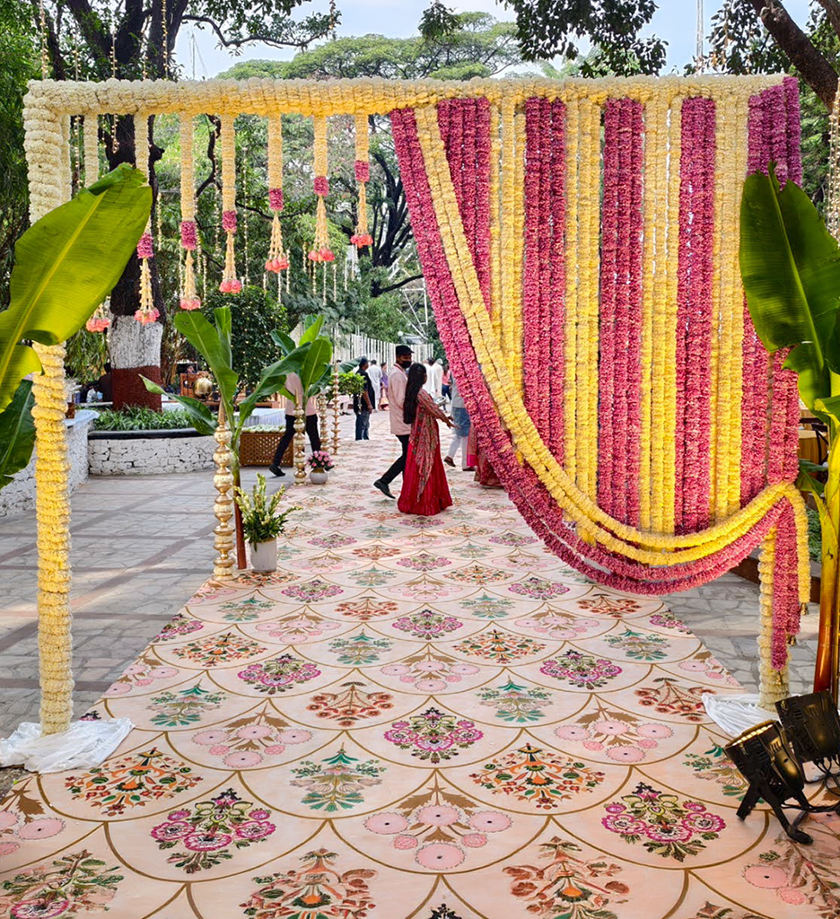 A refined palette of whites, soft pinks, and lush greens was layered across the space, bringing together traditional Indian florals such as tuberoses with contemporary blooms. The result was a setting that felt fresh, elegant, and timeless—where every element complemented the surroundings with understated sophistication.